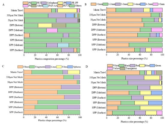 Fibric plastics are mainly derived from clothing [], and plastic groups with a wide range of usage may result from the breakdown of large-scale items []. The most common chemical composition of fibers is PET and cellophane, which made those two polymers the dominant polymers in plankton pump samples. PE (49.06%) was the most abundant in the Manta trawl samples collected by Manta trawls, followed by PP (34.91%), while in the plankton pump samples, the highest PE percentage was 7.14% in DPP surface water samples (Figure 3A,C). Most of those PE MPs in Manta trawl were white spherical plastics which were most likely from personal care products []. This also makes the majority of plastic particles in the Manta trawl samples white (59.43%). Our results collected by the Manta net were highly similar to other results applying Manta trawls [,], as well as results obtained using the Neuston net [].