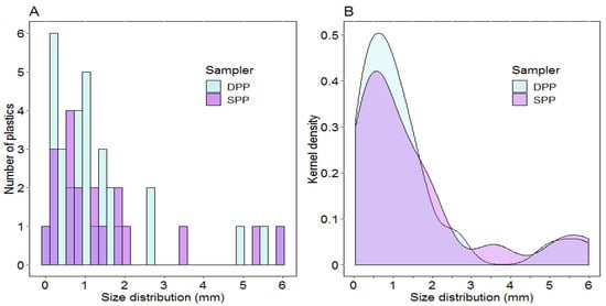 Size distribution (A) and kernel density (B) for plastic samples collected by deep-water and shallow-water plankton pumps. SPP represented shallow-water plankton pump; DPP represented deep-water plankton pump (DPP).