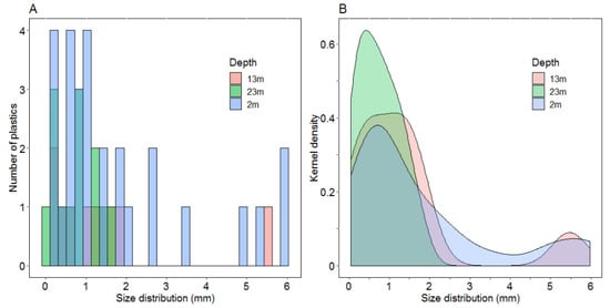 Size distribution (A) and kernel density (B) for plastic samples in different water depths.