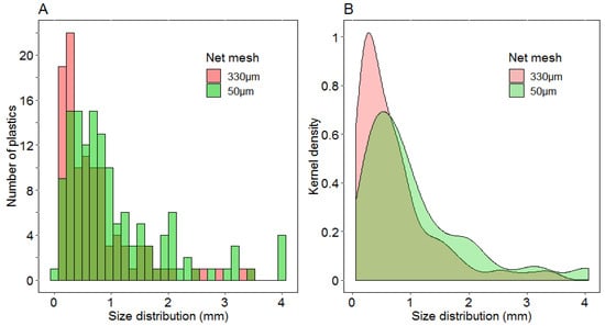 Size distribution (A) and kernel density (B) for plastic samples collected by 50 µm and 330 µm pore size meshes.