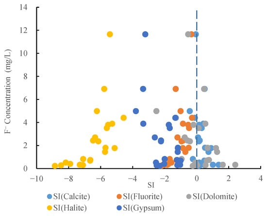 - The main over-standard variables are Na+, F−, SO42−, TDS, and SAR and they are the major concerns for irrigation in the study area. A strong positive correlation exists between F− and SAR and a negative correlation exists between F− and Ca2+. Na+ concentration in the mine water is affected by the dissolution of rock salt and silicate, as well as reverse cation exchange; F− concentration is affected by reverse cation exchange and replacement between OH− in alkaline water and F− adsorbed on the surface of minerals. Fluorite, rock salt, and gypsum are in an unsaturated state in the mine water and they dissolve and release Na+ and F− in goaf.