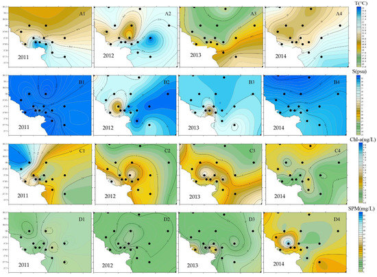 As shown in Figure 3, SST showed an overall trend of being high in the south of the estuary and being low in the north; SST in estuarine waters was generally higher than offshore, among which, the average SST in 2013 was the lowest in four years. The gradient of SSS change in 2011 and 2014 was small, the average value of SSS at each station was around 29, and an obvious low–salinity area was formed in the northern part of the estuary in 2012 and 2013. From 2011 to 2013, the Chl–a concentration showed a trend of high estuary and low offshore and mostly formed a high value area in the northern part of the estuary, with the average Chl–a concentration of each station exceeding 3.5 µg/L; in 2014, the Chl–a concentration in the estuary was lower than offshore, with the average concentration of each station being only 2.5 µg/L: the lowest in four years. From 2011 to 2013, the gradient of SPM concentration was low, with the average concentration at each station fluctuating between 8.65 and 13.96 mg/L; in 2014, high values were formed in the northwest and southeast of the estuary, and the average concentration at each station was the highest in four years, with a value of about 25 mg/L. The pH concentration showed an overall trend of high estuarine waters and low offshore waters, with the average pH value of each station being the lowest in 2014 and the highest in 2011. The overall DO concentration in the northern part of the estuary was higher than that in the southern part of the estuary; high-value areas were formed in the eastern, western, and northwestern parts of the estuary from 2011 to 2013, respectively. The gradient of DO change in 2014 was small, and the DO concentration of each station fluctuated between 8.18 and 9.05mg/L (Figure 3, Table 1).