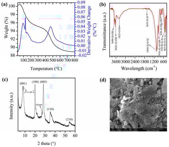 Physicochemical characterization of MMT. (a) TGA profile. Coordinates: Black color: Weight (%) vs. Temperature (°C); blue color: Derivative weight change (%/°C) vs. Temperature (°C); (b) FTIR spectra; (c) XRD analysis; (d) SEM micrograph.