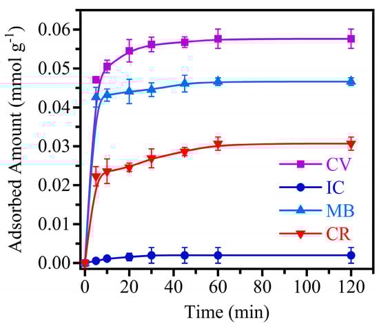 The efficiency of MMT at absorbing both anionic (IC and CR) and cationic dyes (CV and MB) was evaluated, as shown in Figure 2. The results showed that MMT reached equilibrium in 60 min, following the order: CV > MB > CR > IC. The adsorption of the dyes using MMT can be attributed to the development of the surface area (BET), surface charge and the interlayer spacing of the natural clay [29]. The XRD analysis of MMT (Figure 1c) showed an inter-planar spacing of 11.09 Å. Therefore, due to the higher molecular size in terms of length, height or width of CV (11.37 Å × 8.70 Å × 10.25 Å) [31], MB (14.3 Å × 6.10 Å × 4.0 Å) [32], IC (17.71 Å × 8.03 Å × 6.16 Å) [33] and CR (26.2 Å × 7.40 Å × 4.30 Å) [32] none of the contaminants could enter the clay gaps. In this way, it can be assumed that there was no ion exchange between the pollutants and the Mg, Al, Si, Na and Fe ions present in the MMT as reported by the EDS analysis (Table 1). This suggests that the adsorption of the tested pollutants occurs via a different surface phenomenon.