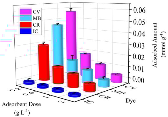 The effect of the adsorbent dose on the amount of IC, CR, MB and CV adsorbed onto MMT is reported in Figure 3. The Figure shows that for each of the experiments, the amount of adsorbed dye per unit mass of adsorbent decreases with an increase in adsorbent dose. This is due to the concentration gradient between solute concentrations in the solution and the adsorbent surface. Thus, with increasing adsorbent dosage, the amount of dye adsorbed by unit weight of adsorbent is reduced, causing a decrease in adsorption capacity. However, there is an increase in the removal percentage of IC (from 3.2 to 16%), CR (from 50 to 88%), MB (from 76 to 91%), and CV (from 90 to 99%), with an increase in MMT dosage from 0.2 to 1 g L−1 (Figure S6). This can be attributed to the increased surface area and the availability of more adsorption sites [12]. However, at doses of MMT above 1 g L−1 there is an excess of clay, and the adsorption of pollutants does not increase. Therefore, under the conditions studied, a dose of 1 g L−1 will avoid incurring additional process costs.
