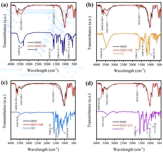 FTIR spectrum before and after the adsorption of the dyes in distilled water using MMT. (a) IC; (b) CR; (c) MB and (d) CV. Conditions: dye concentration 1.23 × 10−5 mol L−1, adsorbent dose 1 g L−1, particle size <200 μm. pH: IC: 5.7; CR: 6.5; MB: 5.6; CV: 7.3, temperature 25 °C, stirring rate 200 rpm.