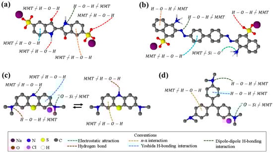 For MB, Figure 5c illustrates electrostatic attractions between the positively charged amine of the dye and the Si-O- group of the MMT. Even hydrogen bonds can occur between the N of the neutral amine and the H of the water in the clay. Furthermore, MB can be in its neutral form, thus it can form hydrogen bonds between the hydrogen of the amine of the aromatic ring and the water present in the MMT.