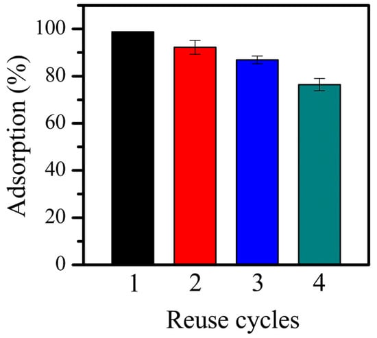 The positive results obtained for removing CV using MMT are a good reason to study other properties of the material, such as its reusability. Therefore, the reuse of MMT after CV removal was explored. Figure 6 shows that the adsorption percentage of the dye decreases when the MMT is reused. However, clay can be effective for up to 4 cycles, reaching 76% of pollutant removal in the last cycle. This additional advantage of MMT favors its use in complex water treatment.