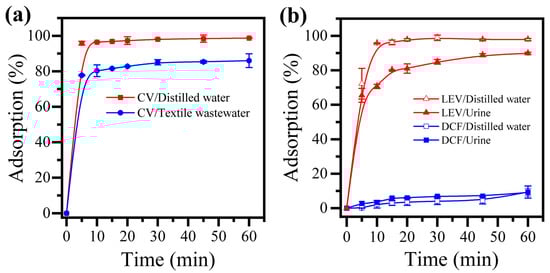 Complex matrix effect using MMT. (a) Adsorption of CV in distilled water and textile wastewater; (b) LEV and DCF adsorption in distilled water and urine. Conditions: pollutant concentration 1.23 × 10−2 mmol L−1 (CV: 4.85 mg L−1, LEV: 4.44 mg L−1, DCF: 3.64 mg L−1), adsorbent dose 1 g L−1, particle size <200 μm, temperature 25 °C, stirring rate 200 rpm. Experiments were performed at natural pH, for example 7.3 for CV in distilled water and 10 for CV in textile wastewater. For LEV and DCF in distilled water, the pH was 6.3 and 6.0 respectively, while in urine the pH was 6.0 for both pharmaceuticals.