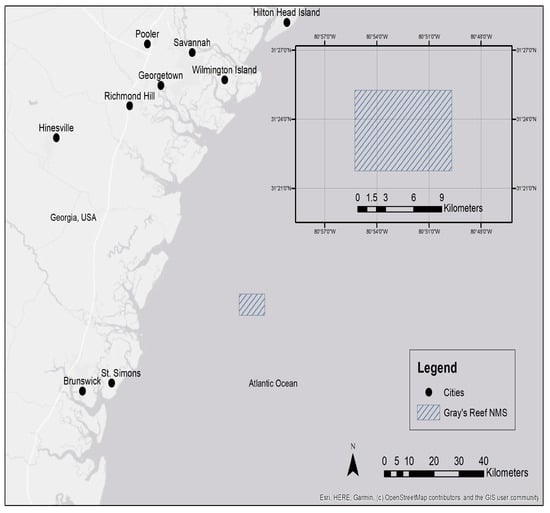 The study area is Gray’s Reef National Marine Sanctuary, which is one of the 15 national marine sanctuaries in the US. GRNMS is located off the coast of Georgia and is considered as one of the largest near-shore “live-bottom” reefs of the Southeastern US [39]. It is currently the only protected natural reef area on the continental shelf off the Georgia coast, and one of only a few natural MPAs between Cape Hatteras, NC and Cape Carnival, FL. It is only approximately 57 square kilometers in size and yet its value is recognized nationally and internationally as a natural marine habitat. Figure 1 shows the location of GRNMS.
