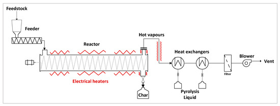 The solids residence time in the reactor can be varied from few minutes to 1 h by adjusting the rotating speed of the reactor screw, which transports the material from the inlet section to the final discharge as char in a sealed vessel for collection. The reactor is equipped with an auxiliary gas injection port section, which allows the entrance of N2, maintaining an inert atmosphere. The reactor has three main independent heating sections, used to effectively control the heating rate and provide an extra degree of flexibility. Five principal thermocouples are located along the reactor’s length to monitor the reactor temperature. Pyrogas is withdrawn by a fan, which maintains reactor’s pressure slightly below atmospheric. The condensation unit consists of two in-series, water-cooled, surface heat exchangers, which enable condensation of the aqueous phase and organic fraction of the pyrogas. A demister is located upstream the fan to remove the remaining impurities in the pyrogas. A scheme of the reactor is reported in Figure 1.