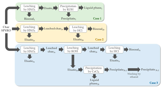 In one case (case 1), KOH was added to the eluate to maximise precipitation of all inorganic compounds. The precipitation by KOH was stopped when a pH of 6–8 was reached in the liquid phase. In a different case (case 3), KOH was used as leaching reagent, while calcium chloride (CaCl2) was added to the second eluate to cause the separation of the dissolved compounds of interest in solid form. CaCl2 was provided as powder (assay ≥ 96). For the precipitation test by CaCl2, the dosage of the reagent was calculated based on a set molar ratio between the calcium to be added and the phosphorous to be removed in the eluate. The improvement process carried out during the experimental campaign led to identification of the three processes (cases), including one (case 1) or more (cases 2, 3) chemical leaching step(s) followed by an eventual chemical precipitation phase (cases 1, 3). The processes involved in the cases, described in the following paragraphs, had a common aim: reduction of char mineral matter, with a separation of the most valuable inorganics, and the consequent increase of the biocoal carbon percentage content.