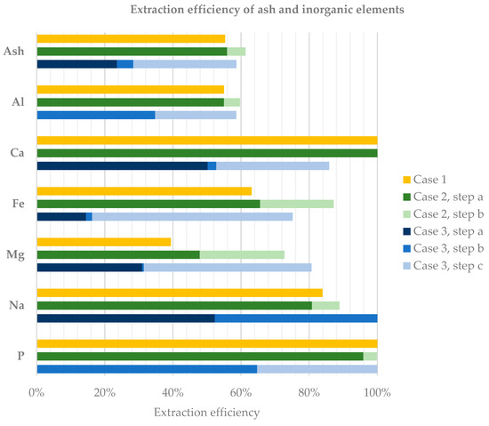 As visible from Figure 3, which reports the performance in terms of ash and inorganic elements extraction rate obtained by the three performed test cases, high extraction efficiency was achieved for P and Ca in all the three cases, while the extraction efficiency of aluminium did not overcome 60%. Potassium extraction efficiency was not reported in Figure 3 as this parameter could be determined only for case 1 and case 2. For these two cases, the extraction efficiency of potassium was found to be 33.6% and 42.5%, respectively.