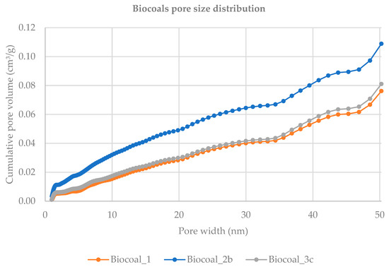 The char produced from case 3 presented reduced surface area compared to case 2 (42 m2/g), probably due to a higher ash content. As visible from Table 15, surface area increases with a decrease in ash content in the biocoal [37]. The pore size distribution of the biocoals, determined by DFT method, is reported in Figure 5, showing an increase in the cumulative pore volume (analysed in the range 0–50.2316 nm) from biocoal1 to biocoal2b, similar to surface area.