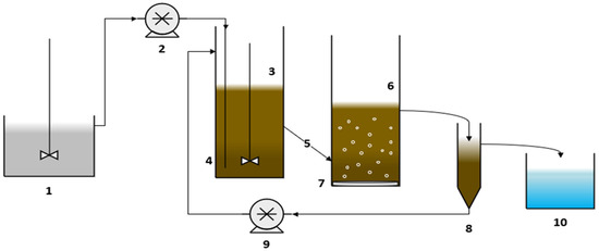 Schematic figure of the lab-sale CFR system. 1—Feed reservoir; 2—Feeding pump; 3—Anaerobic reactor; 4—Bottom feeding; 5—Connecting pipe between reactors; 6—Aerobic reactor; 7—Air diffusor; 8—Clarifier; 9—Recycling pump; and 10—Treated effluent tank.