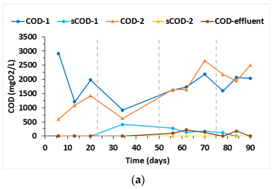 During phase 1, it was noticed that the biomass concentration in both reactors gradually decreased. The flocculated sludge was removed in the clarifier, but the reactors’ biomass growth did not compensate for this removal. The OLR used seems to be insufficient to guarantee the growth of microorganisms, a situation already reported in another study [67], in which a lack of carbon source was observed when an OLR of 1.3 kg/(m3·d) was used. Notwithstanding, in phase 2, the OLR was sufficient for the growth and maintenance of microorganisms, as seen in Figure 2.