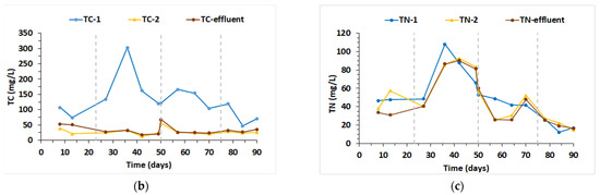 (a) Evolution of the COD and sCOD concentrations in the anaerobic reactor (1), the aerobic reactor (2), and the treated effluent. The values presented as 0 mgO2/L correspond to values <100 mgO2/L (below the limit of quantification). (b) Evolution of the TC concentrations in the anaerobic reactor (1), the aerobic reactor (2), and the treated effluent. (c) Evolution of the TN concentrations in the anaerobic reactor (1), the aerobic reactor (2), and the treated effluent.