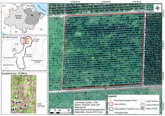 Location of the study area and the micrometeorological tower in the açaí plantation.