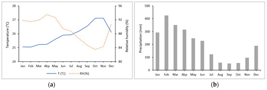 (a) Average monthly temperature and relative humidity and (b) average total monthly precipitation from September 2017 to November 2019.