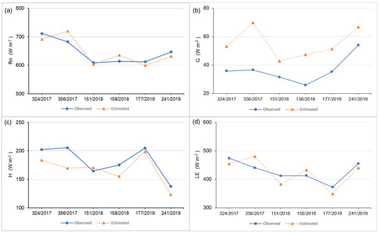 For the heat flow in the soil (G), a greater discrepancy between the data was observed, mainly for 22 December 2017 (DOY 356) (Figure 3b), with the lowest index of agreement observed and errors equal to 64.42%, 20.81 W m−2, and 22.28 W m−2 for MRE, MAE, and RMSE, respectively (Table 3).