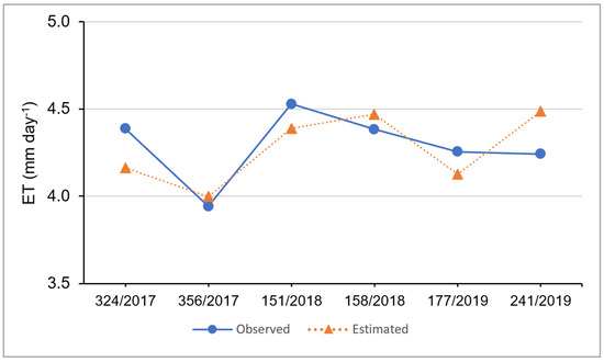 It is also verified that the values of ET inside the plot were greater than 3.0 mm day−1, except for on 26 June 2019 when a lower value was observed of 2.70 mm day−1 as well as a lower average of ET (3.11 mm day−1) (Figure 11e). These results can be explained by the high relative humidity of the air and the low temperature in this period in the region (Figure 3 and Table 2) because these variables comprise the climatic elements that help in the determination of the vapor pressure deficit, which is an indicator of the evaporative capacity of the air.