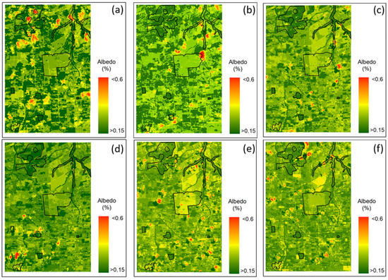 Temporal distribution of albedo (α) on 20 November 2017 (a), 22 December 2017 (b), 31 May 2018 (c), 7 June 2018 (d), 26 June 2019 (e), and 29 August 2019 (f).