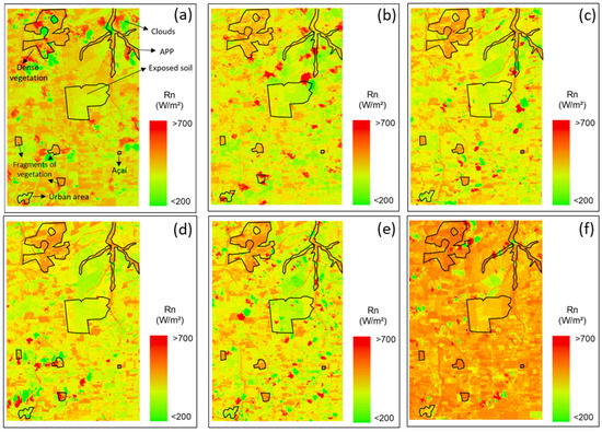 In this study, the obtained average values in the analyzed scenes for the radiation balance (Rn) ranged from 575.10 W m−2 to 629.61 W m−2 (Figure 6). On the surface, the average value was around 646.09 W m−2. Also in northeast Pará, in a study by Freire et al. [53] carried out on a local scale analyzing the radiation balance in mangrove areas, averaged at 1:00 p.m., Rn was between 469 W m−2 and 572 W m−2. On the other hand, Souza, Rocha, and Ribeiro [37] obtained an average of 371.53 W m−2 in the harvest and between harvests of soybeans in eastern Amazonia. In the evaluated areas that had a low vegetation index or exposed soil, the radiation balance value (Rn) varied between 498.35 and 641.49 W m−2 (Figure 6a–f) and albedo between 0.17 and 0.45 (Figure 5a–f), which is related to an increase in the emission of terrestrial radiation resulting in lower Rn values.