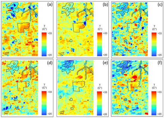 Temporal distribution of the variable surface temperature (T) on 20 November 2017 (a), 22 December 2017 (b), 31 May 2018 (c), 7 June 2018 (d), 26 June 2019 (e), and 29 August 2019 (f).