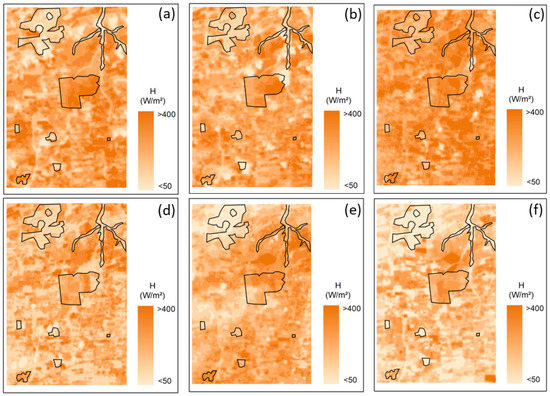 Temporal distribution of the sensitive heat flow (H) on 20 November 2017 (a), 22 December 2017 (b), 31 May 2018 (c), 7 June 2018 (d), 26 June 2019 (e), and 29 August 2019 (f).