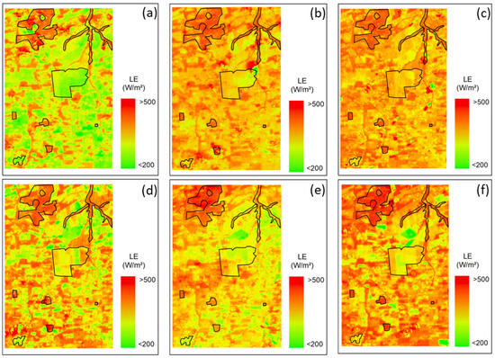 Temporal distribution of latent heat flow (LE) on 20 November 2017 (a), 22 December 2017 (b), 31 May 2018 (c), 7 June 2018 (d), 26 June 2019 (e), and on 29 August 2019 (f).