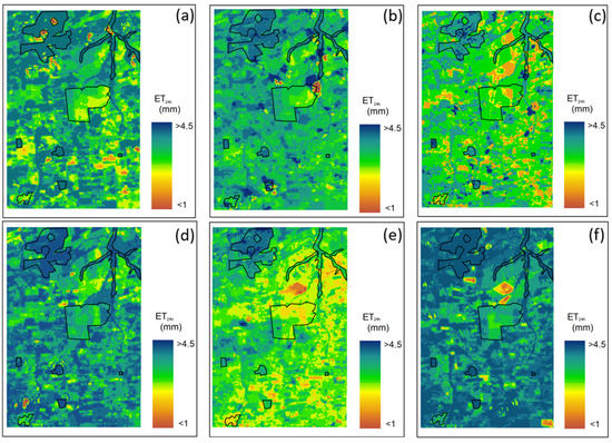 Temporal distribution of actual daily evapotranspiration (ET24h) on 20 November 2017 (a), 22 December 2017 (b), 31 May 2018 (c), 7 June 2018 (d), 26 June 2019 (e), and 29 August 2019 (f).