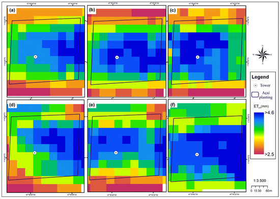 Figure 10a–f refer to the estimation of daily evapotranspiration (ET); the average estimated in the scenes was between 3.28 and 4.14 mm dia−1. The model was able to differentiate ET for the different types of ground cover since evapotranspiration is dependent on both atmosphere and surface parameters, that is, if there are changes in local parameters, this can cause variation in ET values. The highest ET values are in areas with dense vegetation, such as permanent preservation areas and vegetation fragments, which can be Legal Reserve Areas (LRAs), within the properties present in the analyzed area. The high vegetation indices (IAF > 3) found in these places explain the high values of evapotranspiration [47]. As açaí originates from floodplain areas with an abundance of water, the plant demands more water in the form of irrigation on firm ground; however, it is noted that in Figure 11 there are different values of evapotranspiration within the açaí plantation area itself, which would not make it necessary to standardize the use of a specific water blade for the entire area. This is noticeable in the analysis made in this study because currently the owner of the farm uses an empirical fixed slide of 3.28 mm day−1, which added together for the açaí plantation plot results in 265.68 mm day−1, but according to Figure 11e, for example, it results in 253.0 mm day−1.