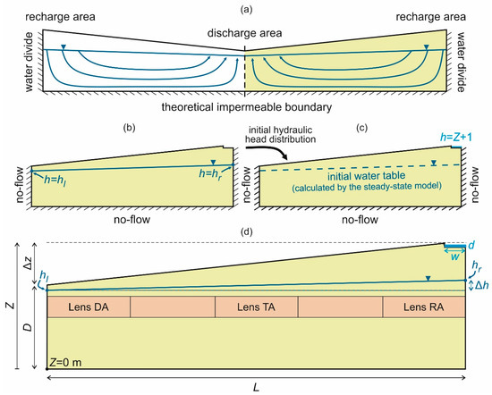 The model geometry and the applied boundary conditions (Figure 1b–d) imitate a theoretical half-basin with water divides at the two sides and an impermeable boundary at the bottom. Due to geometrical reasons (symmetry of the whole basin; Figure 1a), the lateral boundaries at the recharge and discharge areas can be approximated with a no-flow boundary [59,60,61,62,63,64], which can be described by the following equation, Equation (2):