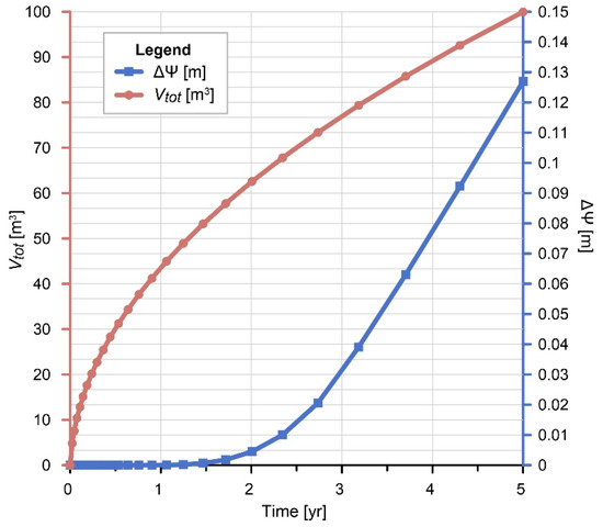 The first scenario is where the topography is flat (Δz = 0 m) and the water level does not have any changes (Δh = 0 m). Here, the water level is at 2 m depth everywhere along the cross-section (L = 2000 m). Figure 2 illustrates the water level increase on the left side of the model (ΔΨ) and the cumulative amount of water infiltrated from the infiltration basin (Vtot) in time. It shows that the water level starts to increase visibly after approx. 1.5 years and reaches an increase of the order of 0.1 m. By maintaining a 1 m water column in the basin, 100 m3 of water infiltrates from the basin within five years (Figure 2). The infiltration is more rapid at the beginning, and then the process starts to slow down.