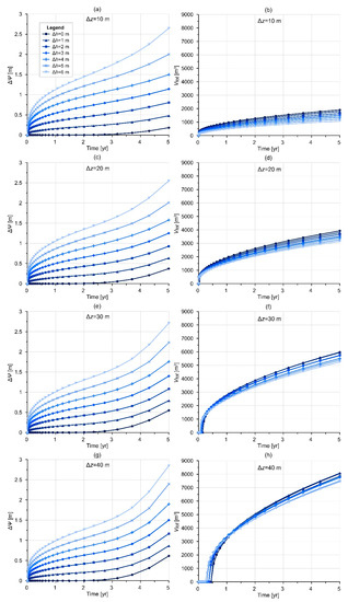 Water level increase starts sooner for the scenarios with Δh = 6 m than for those with Δh = 0 m (Figure 3a,c,e,g). For the latter ones, it takes two to three years to show a visible difference. The main infiltration phase occurs later in case of higher topographic differences (Figure 3b,d,e,h). In the case of Δz = 40 m (Figure 3h), it starts between 100 and 200 days, depending on Δh.