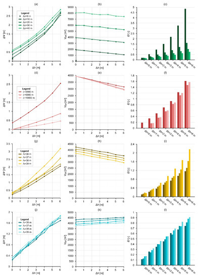 Effect of the topography (a–c), the model length (d–f) and the elevation of the water table (g–l) on the water level increase ΔΨ—(a,d,g,j), the cumulative volume of infiltrating water Vtot—(b,e,h,k), and the Efficiency Index EI—(c,f,i,l) after five years ((a–c): SG-1; (d–f): SG-2; (g–i): SG-3/A; (j–l): SG-3/B) plotted against the hydraulic head difference (Δh).