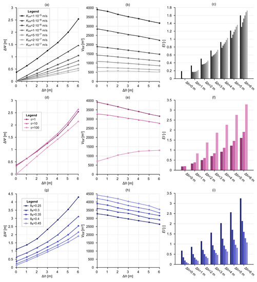 The effect of material properties ((a–c): Kxx, (d–f): ε, (g–i): θs) on the water level increase ΔΨ—(a,d,g), the cumulative water volume of infiltrating water Vtot—(b,e,h) and the Efficiency Index EI—(c,f,i) after five years ((a–c): SG-4/A, (d–f): SG-4/B, (g–i): SG-4/C) plotted against the hydraulic head difference (Δh).