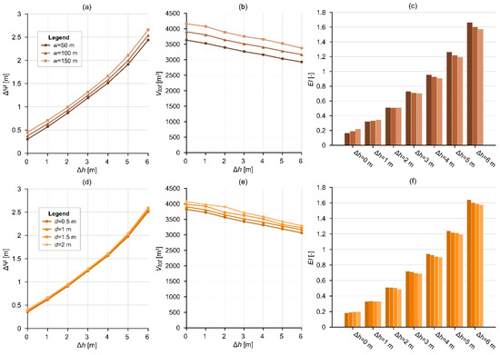 The effect of infiltration basin width (w) and water depth in the basin (d) on the water level increase ΔΨ—(a,d), the cumulative water volume of infiltrating water Vtot—(b,e), and the Efficiency Index EI—(c,f) after five years ((a–c): SG-6/A, (d–f): SG-6/B) plotted against the hydraulic head difference (Δh).
