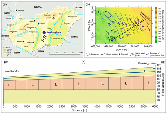 (a): Location of the study area in Hungary. (b): Location of Kerekegyháza, Lake Kondor and the line of the simulated cross-section. (c): Model geometry indicating the location of the middle layer and lenses marked by “L”. The vertical exaggeration is 1:30. Note: The map of Figure 8b uses the Hungarian EOV grid (Uniform National Projection) in which EOV X represents northing and EOV Y represents easting in meters. The topographical data were acquired from the Lechner Knowledge Centre with a resolution of 5 m. The topographical elevation is referenced to the Baltic Sea level. The water level contour map was constructed by the Kriging method based on field measurements in dug wells indicated on the map (time of measurement: 16 September 2020).