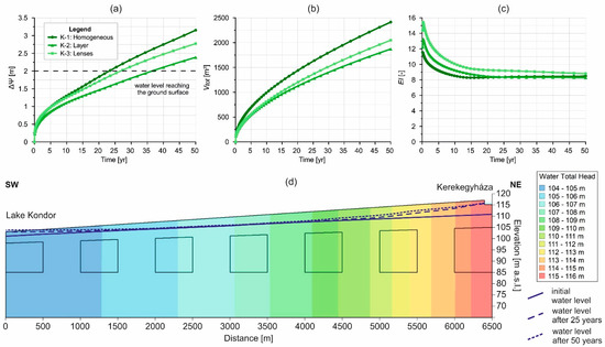 The selected geological properties are imitating a porous aquifer consisting of silty sand [67,68], which is characteristic of the analysed case study area as well. Most model scenarios were homogeneous and isotropic, except for SG-4 and SG-5, where these physical features were tested (Table 1). The general material properties were the following: horizontal hydraulic conductivity in the saturated zone (Kxx): 10−5 m/s, saturated water content (θs): 0.35, residual water content (θr): 0.035 [67,68]. The inbuilt silty sand sample curve was used to estimate the volumetric water content function. For SG-4, the anisotropy coefficient of hydraulic conductivity (ε = Kxx/Kzz) was changed between 1 and 100. For SG-5, five types of heterogeneous geological settings were used: a 10-m-thick layer or different lenses of 400 m length intersected the model domain between Z = 25 and 35 m (Figure 1d) with different hydraulic conductivity values (K’xx changing between 1∙10−7 and 1∙10−5 m/s; Table 1). In these scenarios, the mesh was further refined between Z = 25 and 35 m, using a general mesh size of 2.5 m to achieve more reliable results.