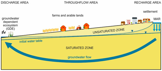Even though the popularity of MAR systems is increasing, and the range of applications is getting broader, including monitoring, risk, impact assessment, and legal and institutional aspects [12,13,14,15,16,17], groundwater flow systems and their regional and local characteristics [18,19], e.g., distribution of natural recharge and discharge areas, as well as groundwater table inclination, are generally not considered in MAR research.