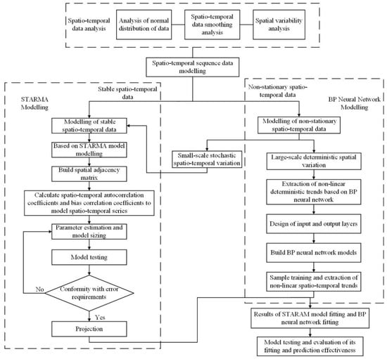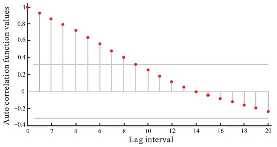 - Model validation. The residual sequence of the model is tested to determine whether it is a random error. If the residual of the model is random error—that is, the mean and auto-covariance of the model residual are 0, and the variance is σ2—then the model is reasonable; otherwise, the selected model is unreasonable, which means that there is a certain pattern in the residual sequence—that is, there is a certain correlation or variability in space–time. If the selected model is unreasonable, it means that there is still some important information in the original space–time sequence that has not been extracted, and then the model and parameter estimation need to be re-selected.