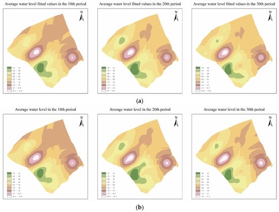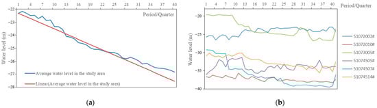 - Time stationarity test [57]. This paper used the spatial trend analysis tool in ArcGIS to analyze the groundwater dynamic monitoring data in the study area as a trend surface to test the spatial smoothness; the test of temporal smoothness is mainly achieved through time series analysis. Time series analysis means that the time series is regarded as a random process that does not vary with time [58]. For a time series , the expression for the mean is