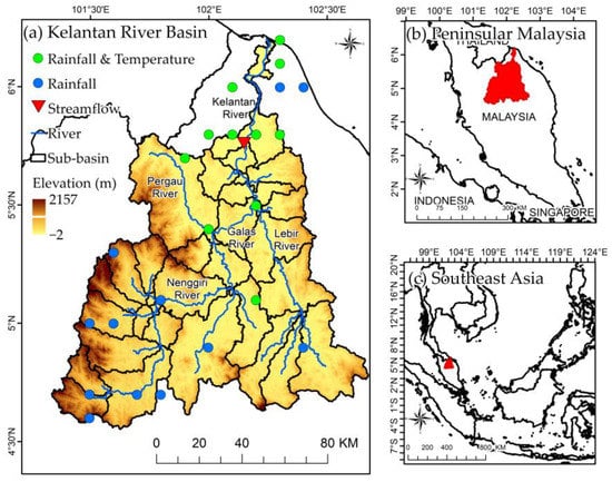 (a) Kelantan River Basin and its location within the (b) Malaysian and (c) Southeast Asian regions.