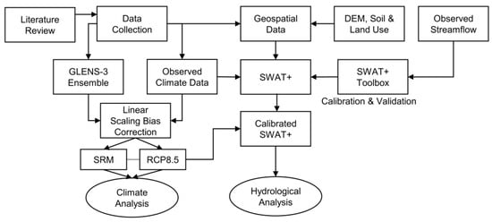 Figure 2 depicts the overall conceptual framework of this research. The data required to conduct this study can be divided into four major types: (1) Climate projections: three ensemble members of GLENS and their corresponding RCP8.5 climate projections (described in Section 2.2); (2) Geospatial data: digital elevation model (DEM), land and soil for setting up SWAT+; (3) Observed daily climate data: precipitation, maximum and minimum temperature data for bias correction of climate projections as well as to set up the SWAT+ model; and (4) Observed hydrology data: daily streamflow data needed to calibrate and validate the SWAT+ model.