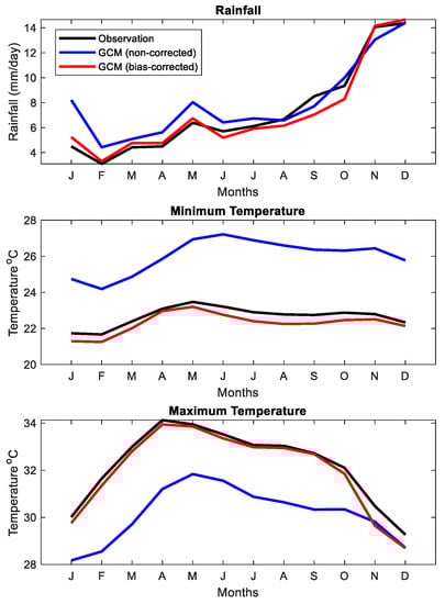 The comparison of catchment averaged daily rainfall and maximum temperature and minimum temperature climatology of the raw GCM simulation and bias-corrected GCM simulation against the observed values from 1981–2009.