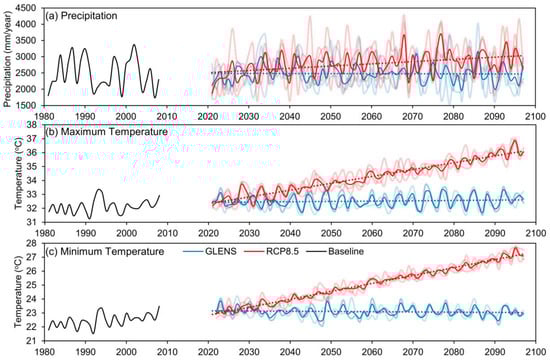The evolution of climatic changes for annual total precipitation and annual mean maximum and minimum temperatures over the KRB from 1981 to 2097 under both the RCP8.5 and GLENS simulations are illustrated in Figure 4. RCP8.5 was chosen because of its high signal-to-noise ratio, which is beneficial for evaluating climatic response in comparison with GLENS []. GLENS simulations show that precipitation over the KRB would typically become less intense under SRM than RCP8.5, offsetting the positive force from the rising GHG concentration. For instance, the increases of annual total precipitation by 6.26% to 18.08% under RCP8.5 could be offset by GLENS, where annual total precipitation was projected to decrease by 2.87% to 6%, as illustrated in Figure 5a,b. A similar offset situation is found in the monthly precipitation simulations, particularly in the early northeast monsoon season (November to January), the flooding period in Malaysia as indicated in Figure 5d. The decreases of monthly precipitation under SRM could be helpful to reduce the risk of flooding in the basin. However, similar decreases in monthly precipitation can also be found during the dry season from February to May, showing that SRM may intensify the water scarcity issue in Kelantan.