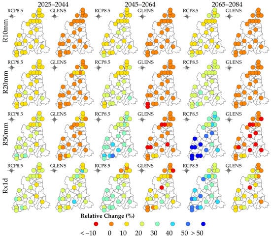 Relative changes in the R10 mm, R20 mm, R50 mm and Rx1d indices under the RCP8.5 and GLENS simulations across the stations during the 2025–2044, 2045–2064 and 2065–2084 periods.