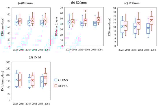 Precipitation extreme indices that are closely related to the occurrences of flood events, R10 mm, R20 mm, R50 mm and Rx1d, were used for the analysis of SRM impact on climatic extremes. Under RCP8.5, the R10 mm, R20 mm and R50 mm indices are projected to increase across the basin by 0.9–11.93%, 2.8–21.64% and 6.41–97.8%, as illustrated in Figure 6. Figure 7 shows that the R10 mm, R20 mm and R50 mm values are higher under RCP8.5 as compared to GLENS for all the three evaluated periods. R50 mm is projected to increase significantly in the south-western and middle parts, up to double the number of days in the 2065–2084 period compared to the baseline period (Figure 6). Meanwhile, under GLENS, the magnitude of the R10 mm, R20 mm and R50 mm changes is greatly reduced and comparable to the historical period, showing SRM can effectively reduce the number of extreme precipitation days in the KRB as compared to RCP8.5.