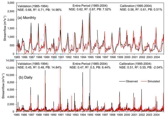 The selection of objective function has an effect on the calibration and validation of a hydrological model []. To solve this problem, this study utilized both manual and automatic calibration procedures for the SWAT+ modelling in the KRB. Figure 8 indicates the SWAT+ simulated flows and observed flows at the Jambatan Guillermard station between 1985 and 2004 for both monthly and daily time scales. The R2 and NSE values are generally greater than 0.5, with the RB values within 15%, indicating the SWAT+ model can adequately capture the variability flows for both the monthly and daily scales. In daily simulation, the performance for the validation period is slightly poorer than for the calibration period; nonetheless, it is still acceptable based on Moriasi et al. []. This is quite a common result, since the parameter values were tested mainly based on the calibration period. Figure 8 shows that SWAT+ tended to underestimate the peak flows; similar findings were reported in previous SWAT studies in tropical regions [,]. This may be due to the lack of well-distributed and good-quality climate data for the model development, particularly in the middle, eastern and south-eastern parts of the basin, as shown in Figure 1 []. In addition, the modules within SWAT+ were developed mainly based on conditions in the United States, which might not perfectly represent the tropical hydrological cycle. However, the statistical metrics indicate that the SWAT+ model is sufficiently reliable for the following analysis.